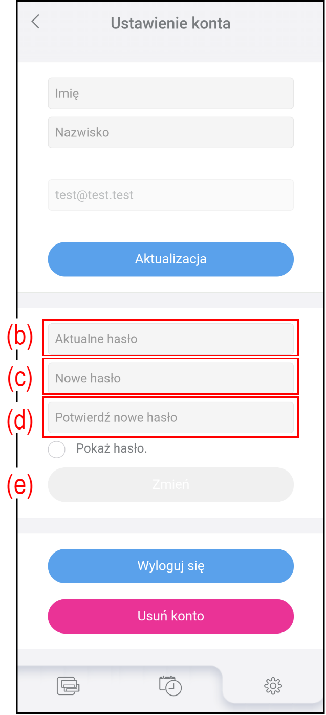 Aby usunąć konto z tej aplikacji i serwera AIRSTAGE Cloud, dotknij przycisku (c).