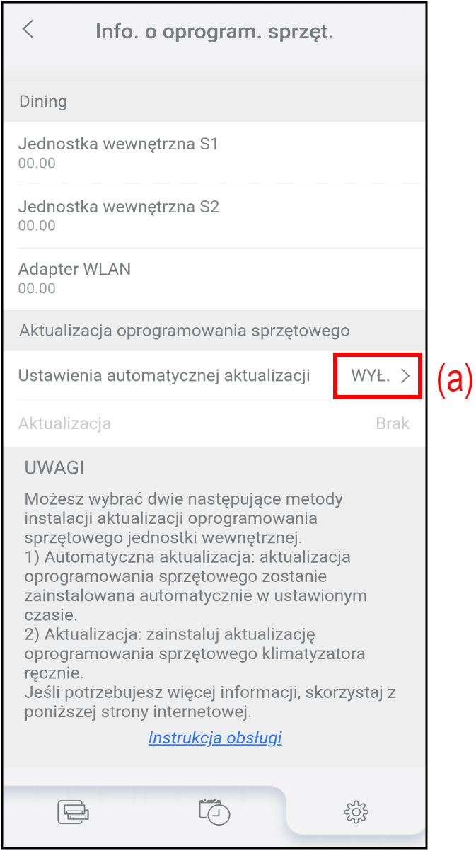 Istnieje możliwość ustawienia godziny rozpoczęcia automatycznej aktualizacji oprogramowania sprzętowego klimatyzatora i adaptera WLAN.