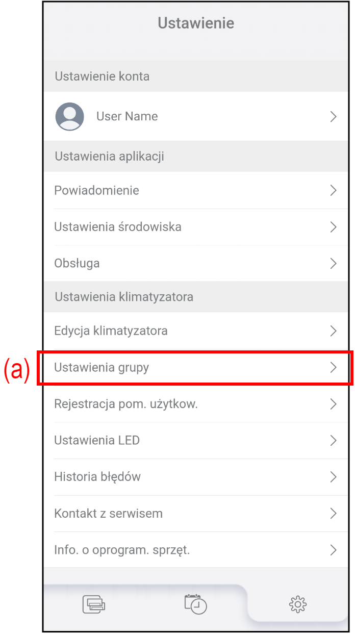 (b) Edycja grupy Dotknij, aby utworzyć nową grupę, edytować nazwę grupy lub usunąć grupę. Szczegóły, patrz „Edycja grupy”. (c) Przenieś urządzenie Dotknij, aby przenieść klimatyzator do innej grupy.