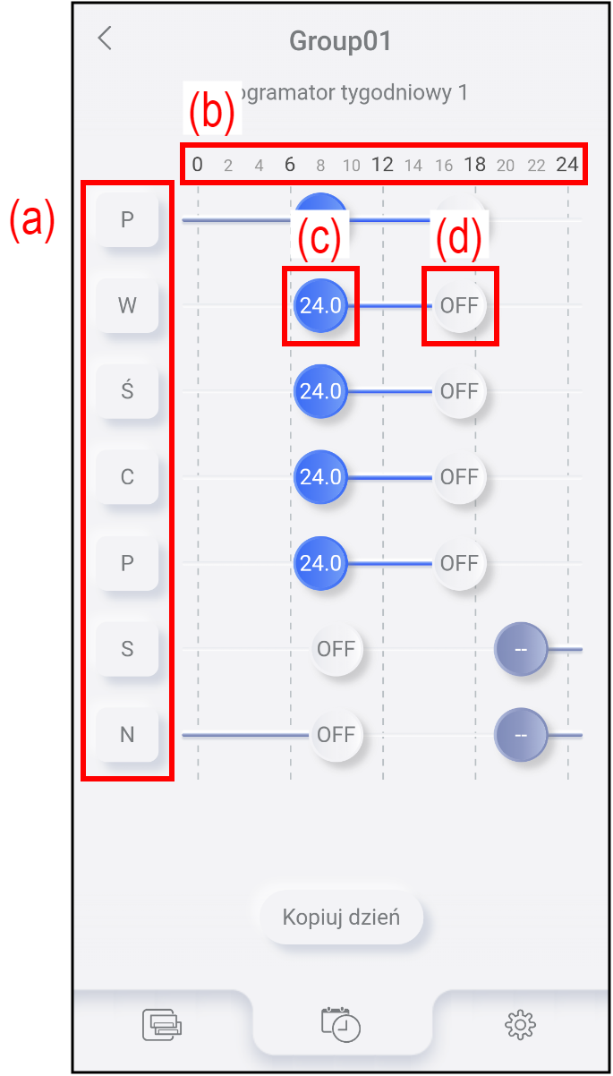 Ekran ustawień tygodniowego regulatora czasowego