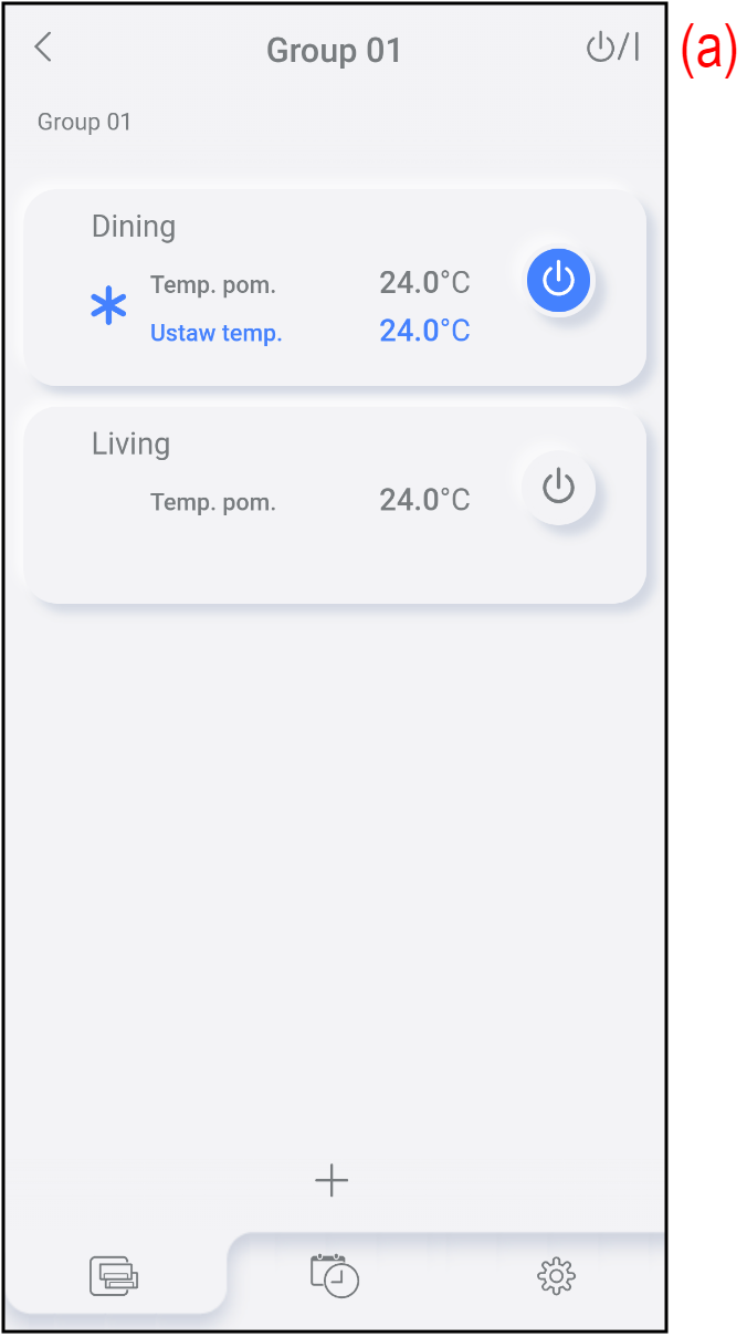 Dotknij (b), aby uruchomić/zatrzymać działanie wszystkich klimatyzatorów w grupie. Szczegółowe informacje można znaleźć w sekcji „Operacja uruchamiania/zatrzymywania wszystkich urządzeń” poniżej.