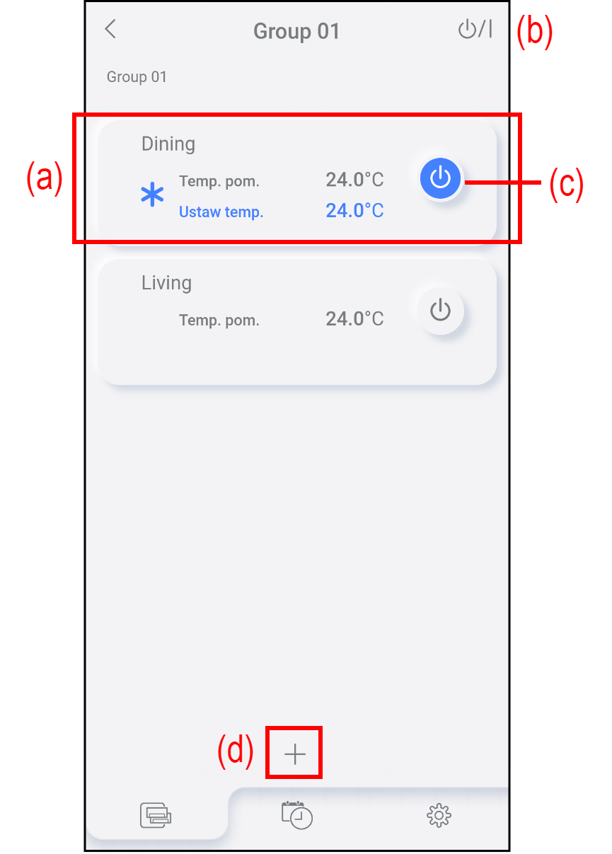 Dotknij (c), aby rozpocząć/zatrzymać działanie poszczególnych klimatyzatorów.