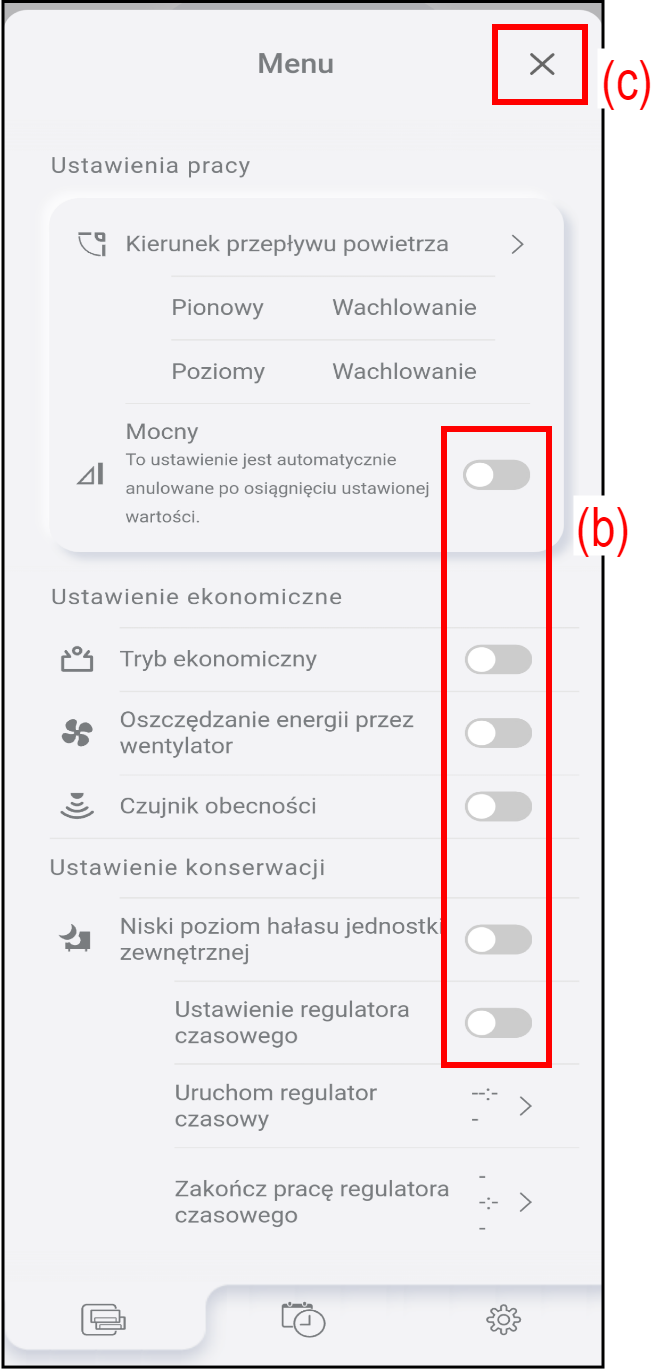 Dotknij (b), aby włączyć/wyłączyć poszczególne funkcje.