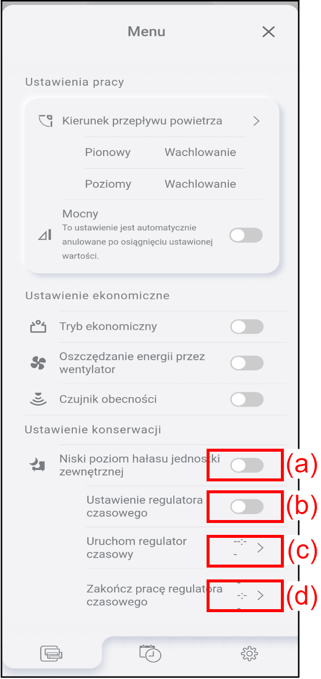 | (c) | Uruchom regulator czasowy | Dotknij, aby ustawić czas uruchomienia regulatora czasowego niskiego poziomu hałasu jednostki zewnętrznej. Funkcja niskiego poziomu hałasu jednostki zewnętrznej jest uruchamiana o ustawionym czasie. |