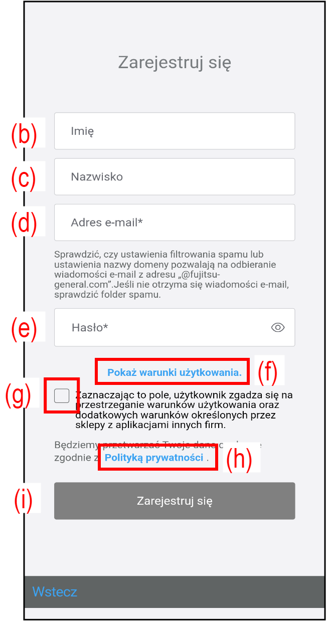 | (d) | Adres e-mail | Wprowadź adres e-mail. Będzie on używany jako identyfikator konta. |