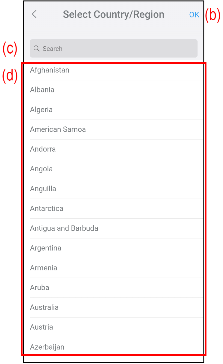 - Selectați țara/regiunea dvs. din listă (d). Puteți căuta țara/regiunea dvs. în „Search” (c).