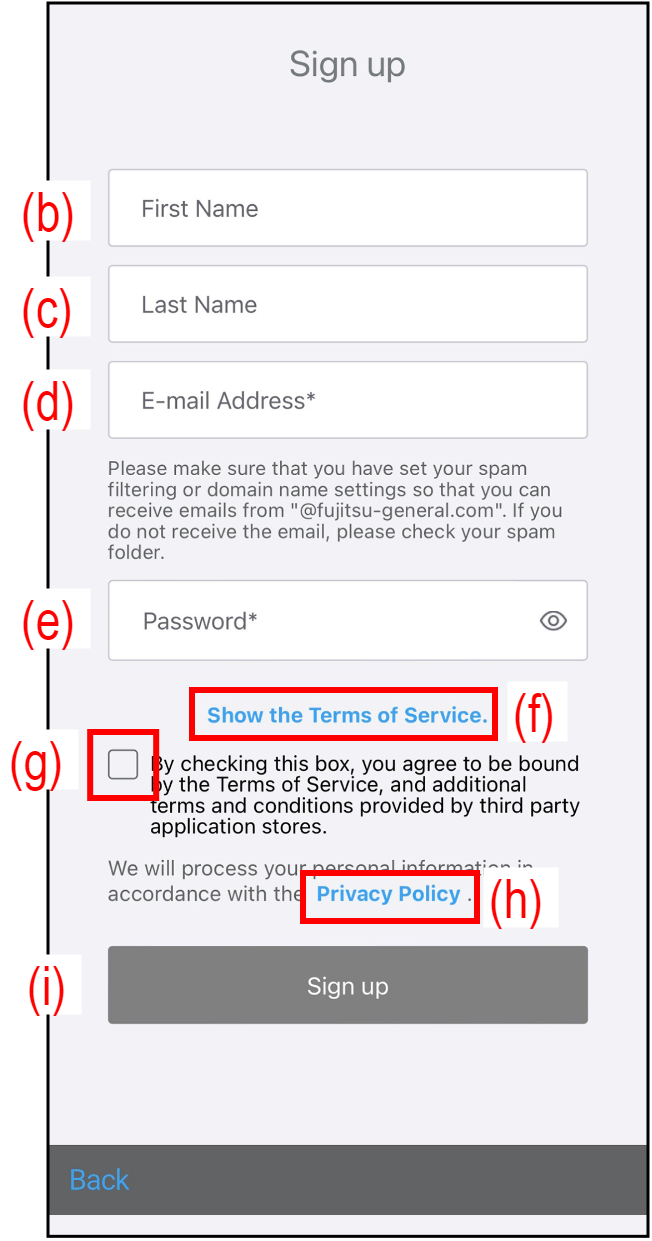 - Atingeți caseta de selectare (g) pentru a accepta Termenii și condițiile.