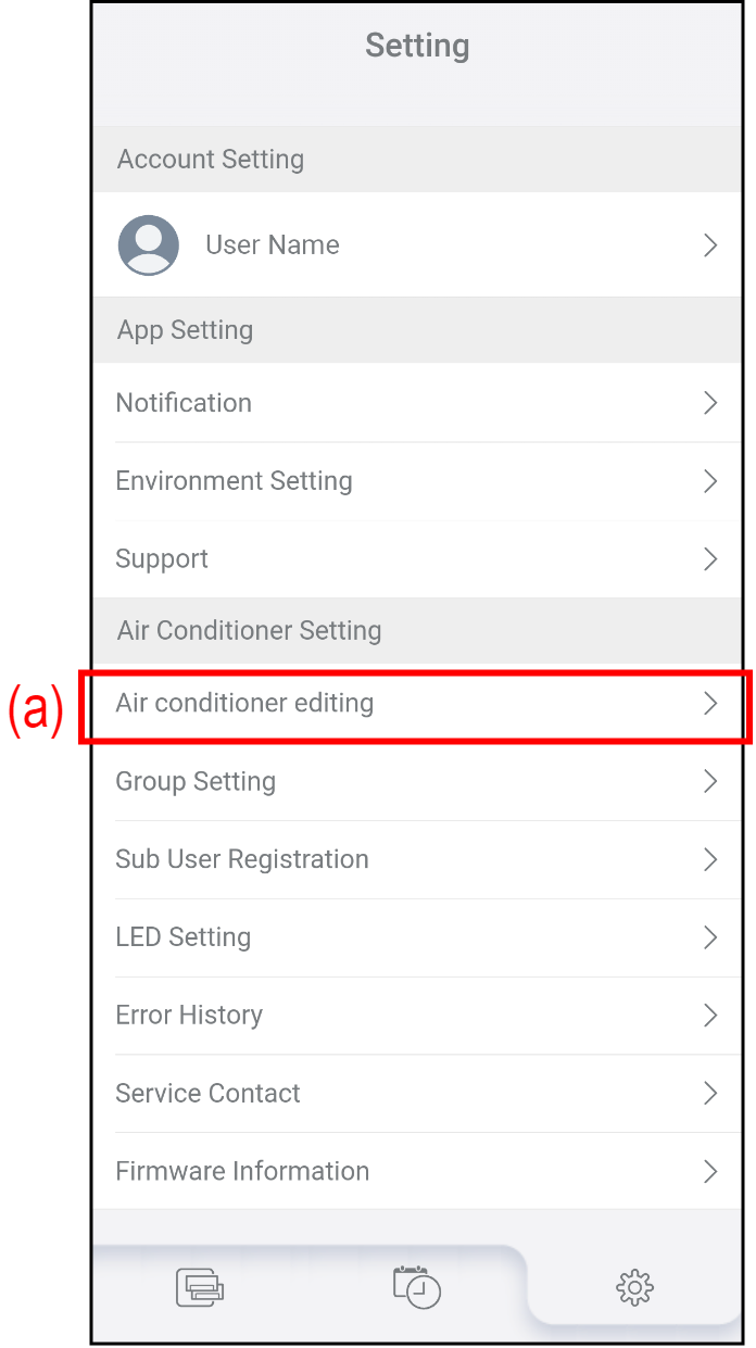 - Atingeți aparatul de aer condiționat (b) al cărui nume doriți să-l modificați sau să-l ștergeți.