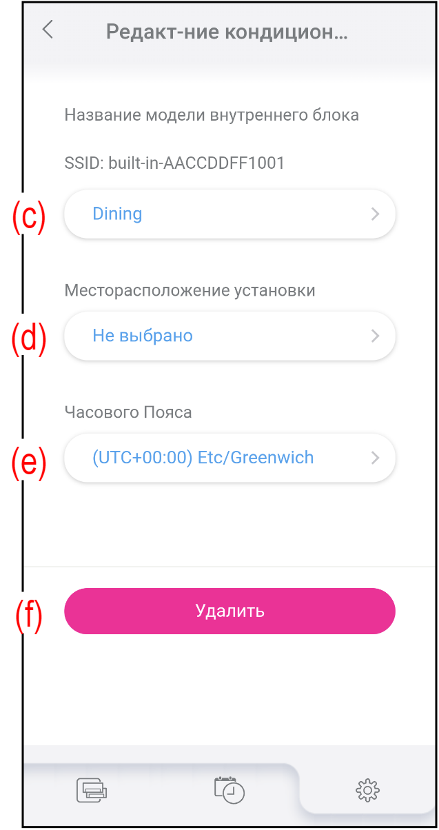 (Режим управления можно поменять в «Настройка среды».)(d) Месторасположение установки Нажмите, чтобы выбрать месторасположение установки кондиционера воздуха. (e) Часового Пояса Нажмите, чтобы выбрать часовой пояс, в котором установлен кондиционер воздуха. Недельный таймер и таймер низкого уровня шума наружного блока работают в соответствии с этой настройкой. (f) Кнопка [Удалить] Нажмите, чтобы удалить зарегистрированный кондиционер воздуха из вашей учетной записи. Если вы нажмете эту кнопку, появится сообщение подтверждения.
