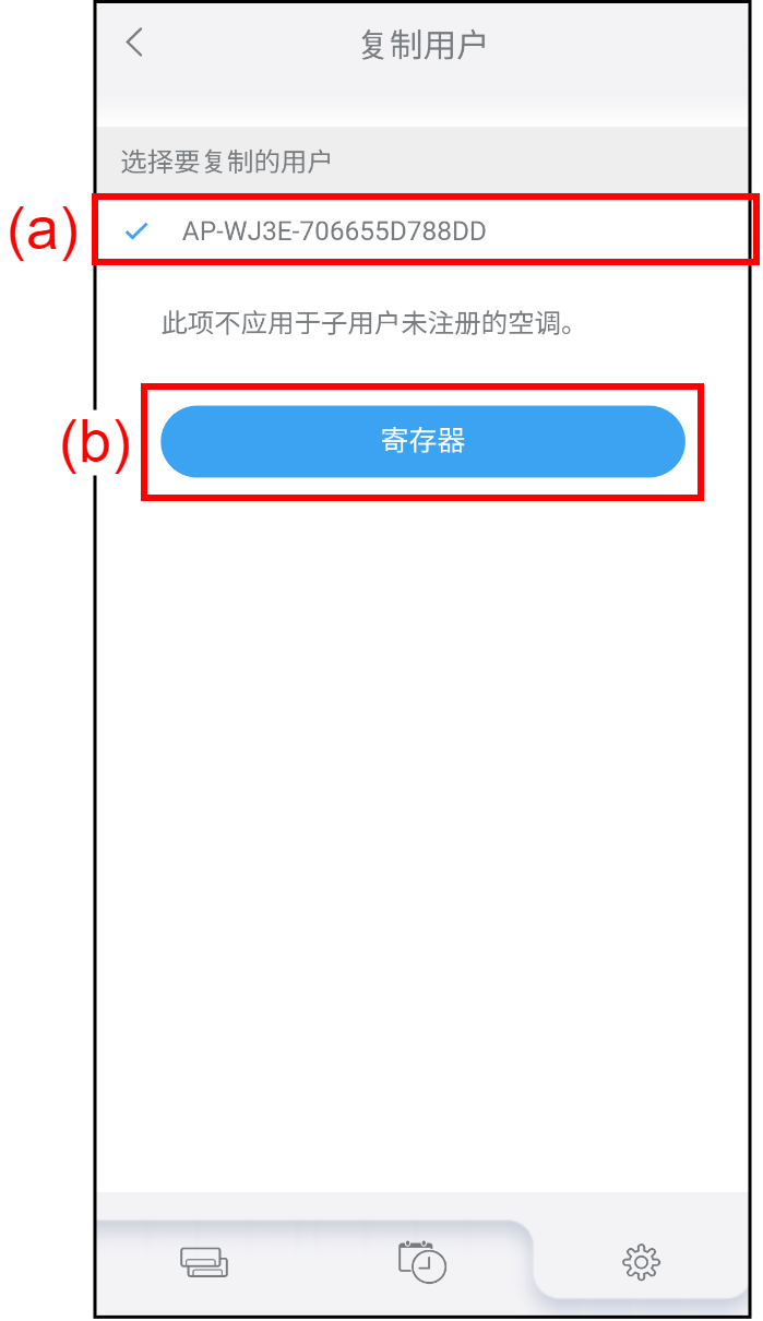- 在“复制用户”画面上选择想要复制子用户设置的空调(a)。