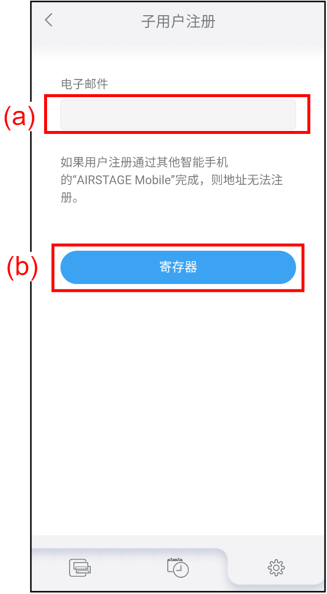 - 在“子用户注册”画面上的(a)中输入子用户的电子邮箱地址。