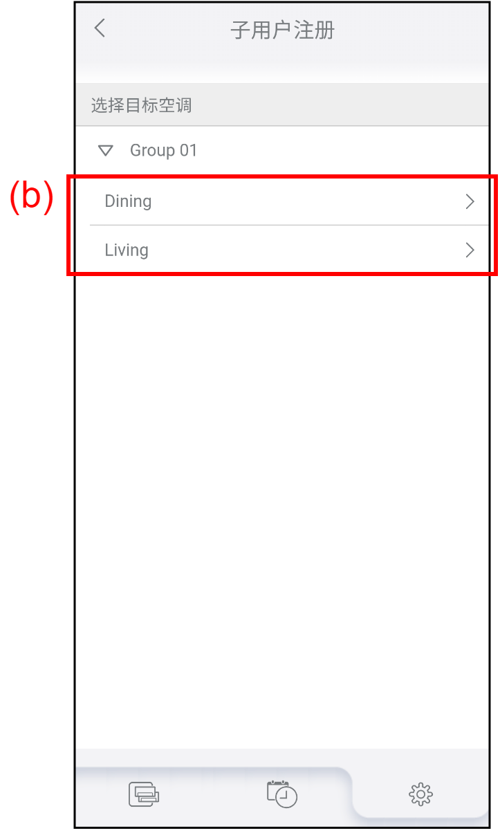 轻按(b)以选择想要添加或删除子用户的空调。