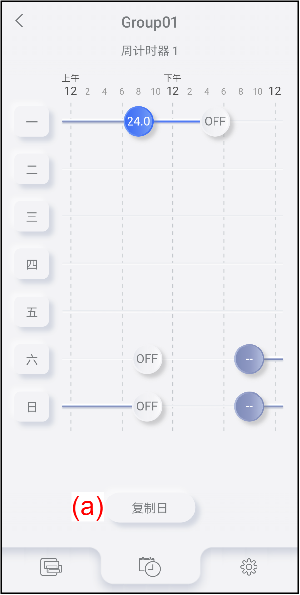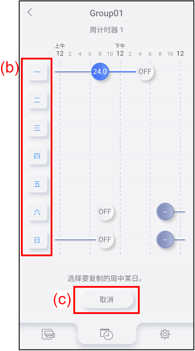 主页 计时器操作 复制计时器设置 可以将周中某日的计时器设置复制到另一天。 轻按周计时器设置画面上的(a)。 从想要复制的日期选择周中某日(b)。若要取消复制,轻按按键(c)。 选择想要复制到的周中某日(d)。所选日期的图标已变为[]。 按(f)完成计时器复制。若要取消复制,轻按按键(e)。 注: 如果计时器已设置为想要粘贴的日期,则会将计时器设置删除,然后复制的设置会将其覆盖。