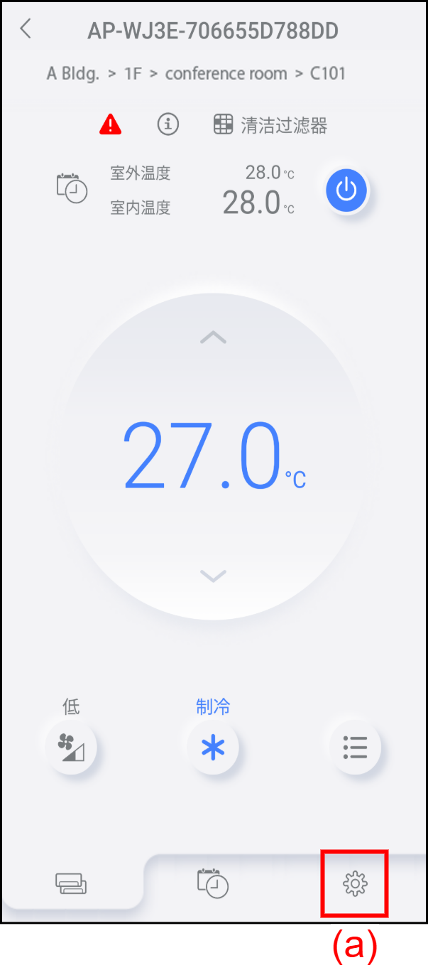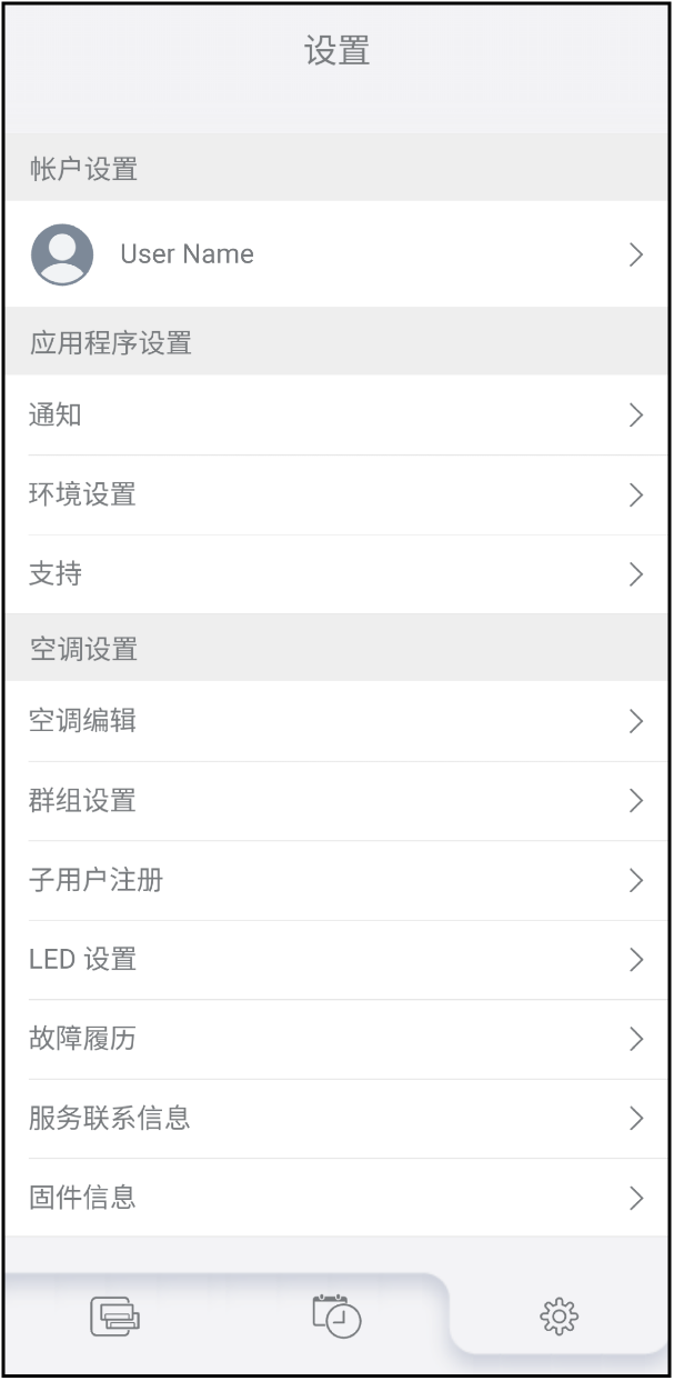 主页 设置 可以从设置选项卡[ ]检查并更改本应用程序或空调的各种设置。 轻按(a)转至“设置”画面。 可以从“设置”画面中检查或设置以下项目。 帐户设置 应用程序设置 通知 环境设置 支持 空调设置 空调编辑 群组设置 子用户注册 LED 设置 故障履历 服务联系信息 固件信息 注: 某些设置可能不会显示,这取决于空调。 多部智能手机同时共享一个帐户时请勿更改设置。这可能会导致设置失败。