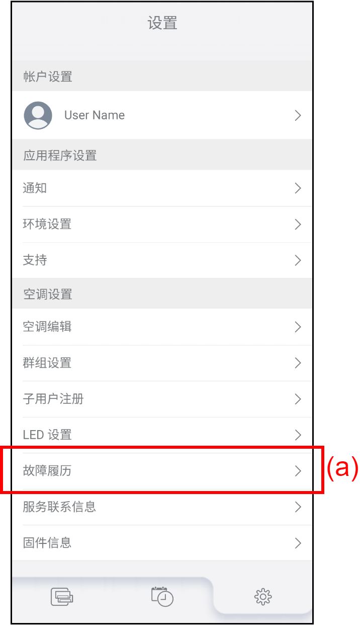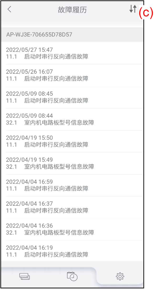 主页 设置 故障履历 可以检查空调的故障履历。 轻按“设置”画面上的(a)以检查故障履历。画面转至“故障履历”。 轻按(b)以选择空调并检查故障履历。轻按[]以显示注册的空调或从属群组。轻按[]以隐藏注册的空调或从属群组。 空调的故障履历按照从最新到最旧的顺序显示。若要切换显示顺序,轻按(c)。