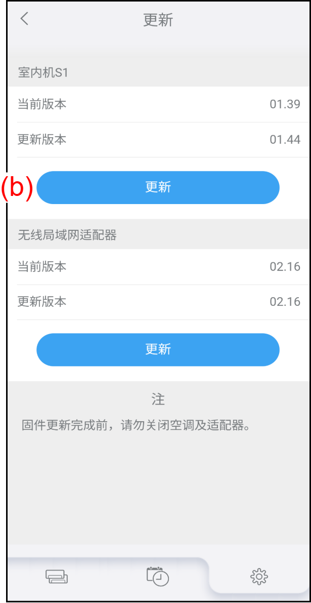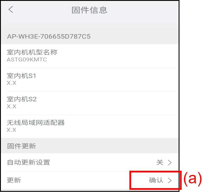主页 设置 固件信息 手动更新固件 注: 子用户无法设置该功能。 可以手动更新室内机和无线局域网适配器的固件。 注: 取决于室内机,“固件更新”可能不会显示。在这种情况下,室内机的固件更新不可用。 如果有新固件发布,则在“固件信息”画面上会出现“确认”。 轻按(a)以检查新版本。 轻按(b)以开始固件更新。更新完成时,将出现信息。 注: 固件更新期间,空调会停止运行并无法控制(最多花费30分钟)。 一旦固件更新开始后,请勿关闭空调和无线局域网适配器直到更新完成。 固件更新后,会将无线遥控器的设置复位。从无线遥控器操作空调以重新发送设置。