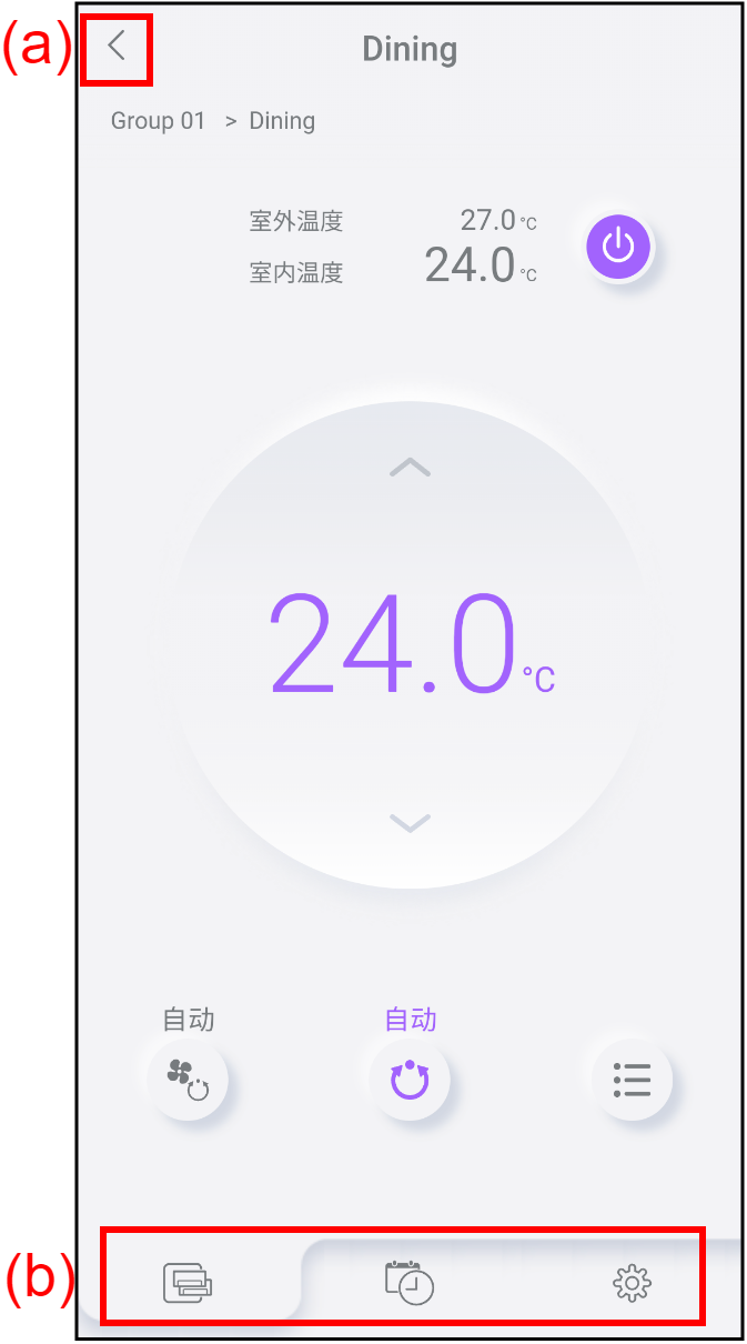 主页 基础指令 本节介绍了本应用程序的基础操作。 若要返回上一画面,轻按(a)。 若要在选项卡之间切换,轻按(b)中的各图标。 空调选项卡 可以从该选项卡检查空调的运行状态并操作空调。参考“主菜单”和“功能设置”了解详情。*设置群组时,图标发生变化。 * 计时器选项卡 您可以在此选项卡上设置周计时器。参考“计时器操作”了解详情。 设置选项卡 可以从此选项卡上检查并更改本应用程序或空调的各种设置。参考“设置”了解详情。 注: 即使在操作期间切换选项卡,也会设置各选项卡的状态。切换回原始的选项卡时,可以从上次停止的地方继续操作。