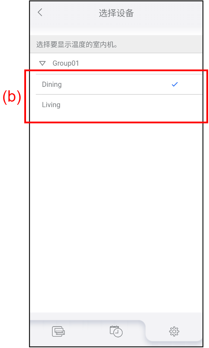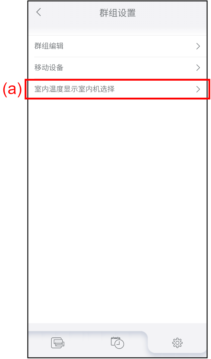 主页 设置 群组设置 室内温度显示设置 可以选择群组中的代表性空调。群组的室内温度显示为代表性空调所测量的温度。 轻按“群组设置”画面上的(a)。画面转至“选择设备”。 轻按(b)以选择用作代表性空调的空调。[]表示所选空调。