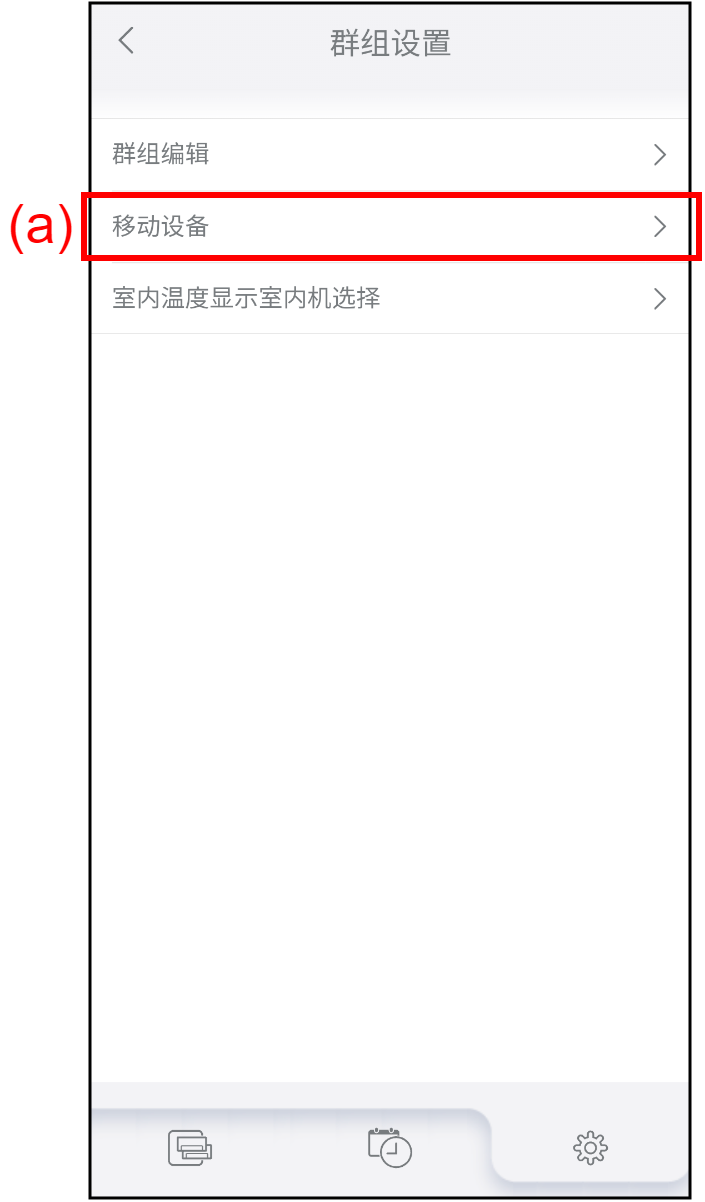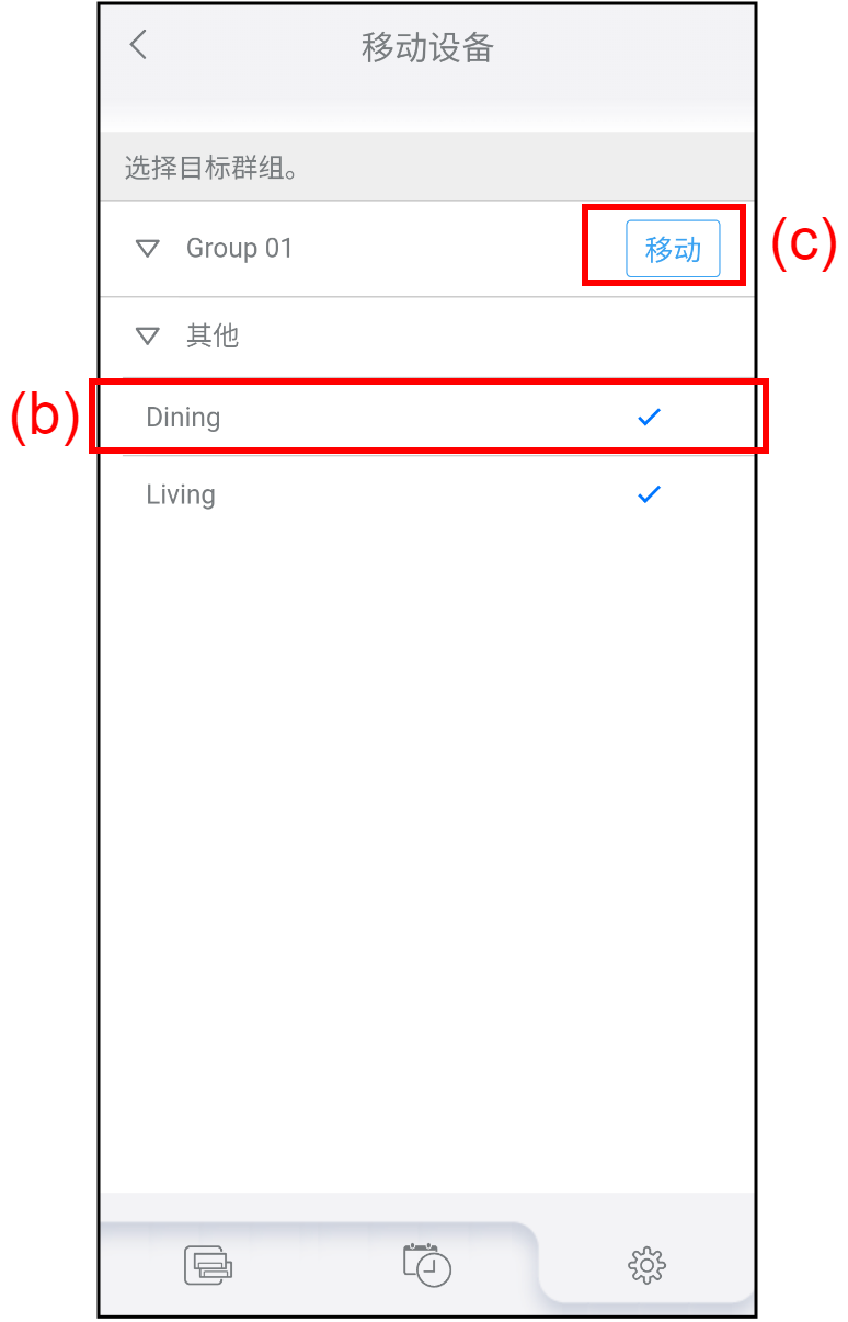 主页 设置 群组设置 将空调移动到另一个群组 轻按“群组设置”画面上的(a)以将空调移动到另一个群组。画面转至“移动设备”。 将出现空调列表画面。未注册到任何群组的空调处于“其他”中。 选择想要移动的空调(b)。[]表示所选空调。 轻按想要移动到群组的按键(c)。所选空调移动到群组。