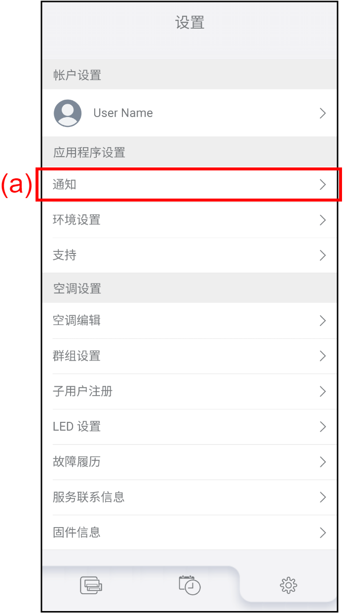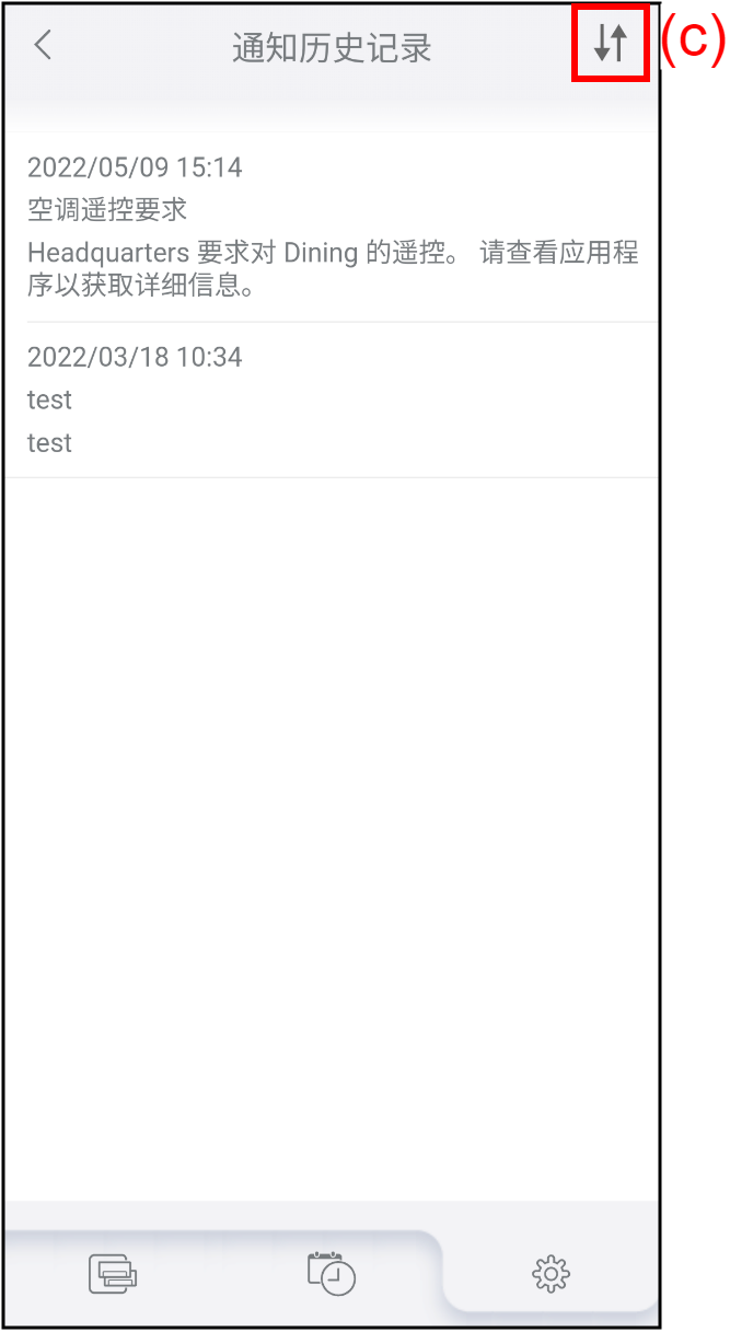 主页 设置 通知 您可以检查您过去收到的通知。 注: 对于Sub users,该功能不可用。 轻按“设置”画面上的(a)检查过去的通知。画面转至“通知”。 轻按(b)显示通知列表。 通知历史记录按照首先显示最新记录的顺序显示。若要切换显示顺序,轻按(c)。