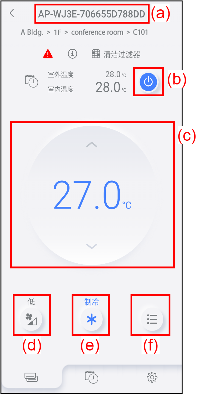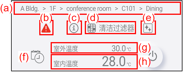 主页 主菜单 各空调画面 这是连接的每个空调的主画面。 (a) 空调名称 显示空调名称。 (b) 打开/关闭按键 轻按以打开/关闭空调运行。 (c) 温度设置 轻按或以更改温度设置。可设置的温度范围因空调而异。 注: 在送风模式下,不会显示温度设置。 在最低热量模式下,设置温度无法更改。 (d) 风扇转速设置 显示当前风扇转速。轻按此图标以更改风扇转速设置。(参考“风扇转速设置”。) (e) 运行模式设置 显示当前运行模式。轻按此图标以更改运行模式。(参考“运行模式设置”。) (f) 功能菜单按键 轻按此图标以设置空调功能。(参考“功能设置”。) <空调上的信息> (a) 群组名称 显示包括空调的群组名称。如果未设置群组,则不会显示该项目。 (b) 故障图标 显示发生了故障。有关详情,请参考“故障提示”。 (c) 信息图标 显示空调处于特殊状态。有关详情,请参考“特殊状态”。 (d) 清洁过滤器图标 显示需要进行过滤器清洁。有关详情,请参考“清洁过滤器”。 (e) 内部清洁图标 显示了正在进行内部清洁(热清洁)。有关详情,请参考“内部清洁(热清洁)” (f) 计时器图标 显示从Mobile应用程序设置的计时器。有关详情,请参考“计时器操作器”。 (g) 室外温度 显示当前室外温度。 (h) 室内温度 显示当前室内温度。 注: 如果室外温度或室内温度超过下表,则会显示“--.-”来取代这些温度。 下限 上限 室外温度 -25°C (-13°F) 50°C (122°F) 室内温度 -10°C (14°F) 40°C (104°F) 取决于您的空调,当前室内温度可能不会出现在画面上。