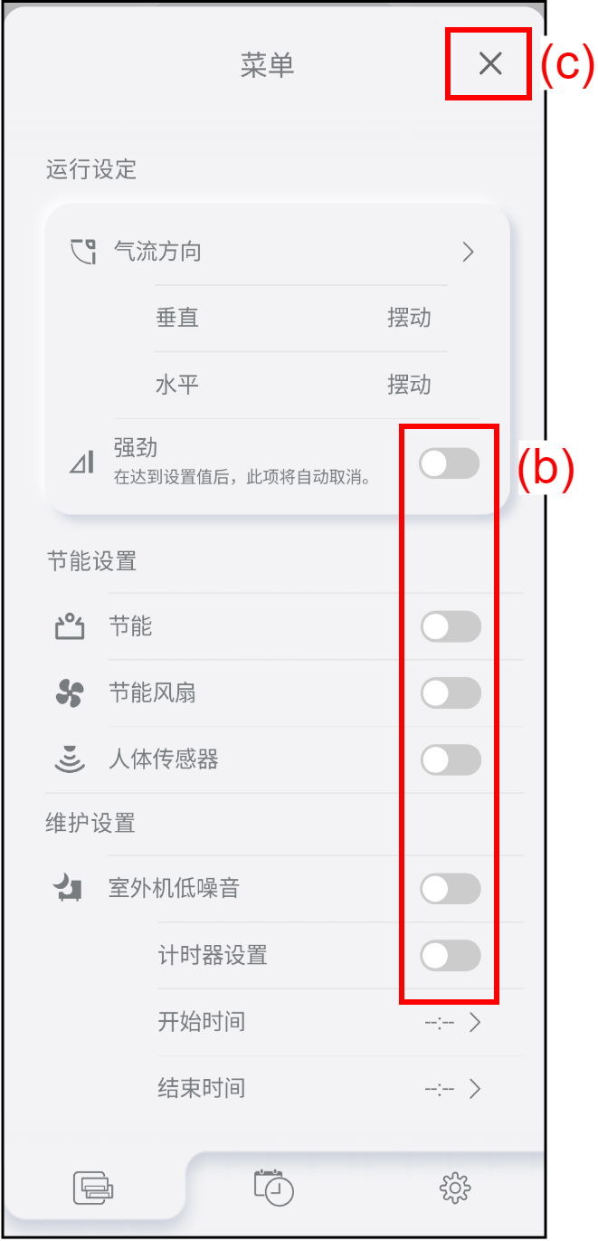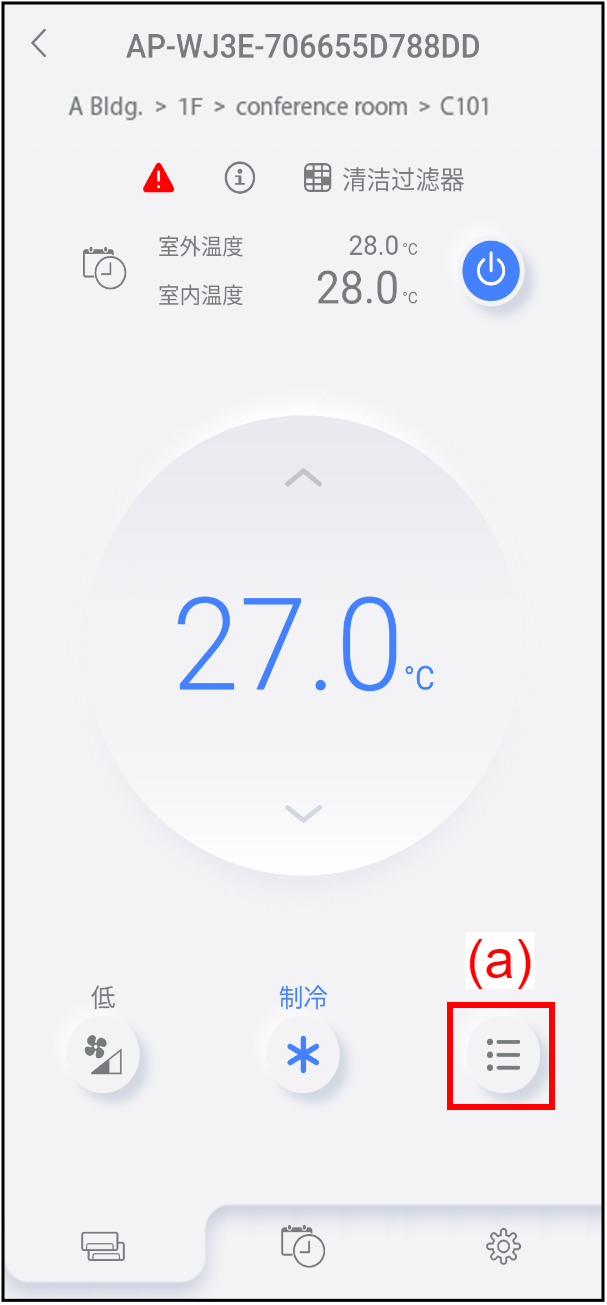 主页 主菜单 各空调画面 功能设置 可以从各空调画面更改运行设定并使用各种功能。 轻按(a)以打开[菜单]窗口。 可以上下滚动[菜单]窗口。轻按(b)激活/禁用各功能。 激活各功能。 禁用各功能。 若要关闭窗口,轻按(c)。 <可用功能和设置> 运行设定 气流方向(上/下或左/右) 强劲运行 节能设置 节能运行 节能风扇 人体传感器 维护设置 室外机低噪音运行 室外机低噪音计时器 注: 有关各功能的详情,请参考空调的使用说明书。 某些功能可能不会出现,这取决于空调。