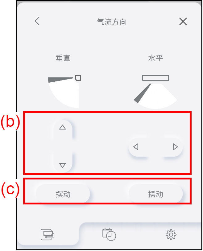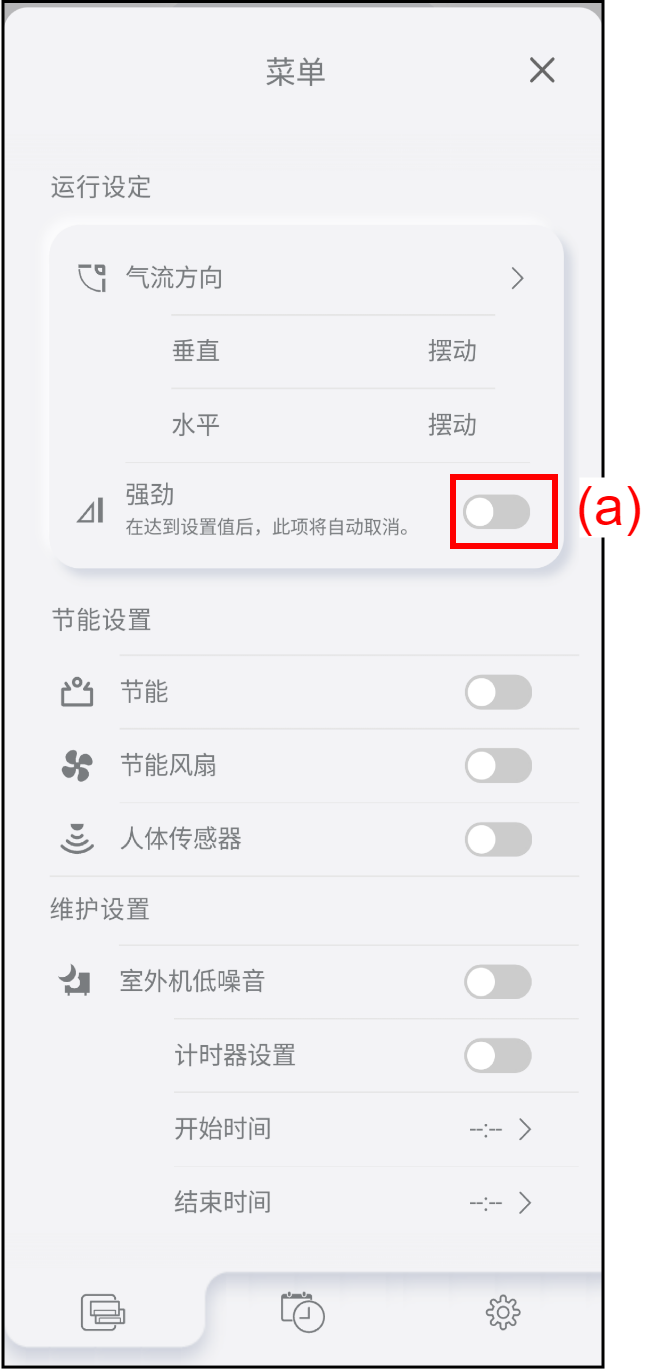 主页 主菜单 各空调画面 功能设置 运行设定 气流方向设置 注: 取决于空调,左/右气流方向设置不可用。 将运行模式更改为自动时,更改气流方向设置之前请等待3分钟。在自动模式下,空调开始监控以确定适当的运行模式。监控操作期间更改气流方向可能会导致故障。 轻按(a)以调整上/下或左/右气流方向。 轻按(b)以调整气流方向。轻按(c)以开始/停止摆动运行。 强劲运行 注: 取决于空调,可能不会出现在画面上。 轻按(a)以开始/停止强劲运行。 室内温度达到设定温度后,强劲运行自动关闭。