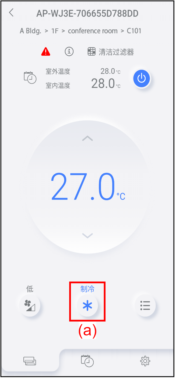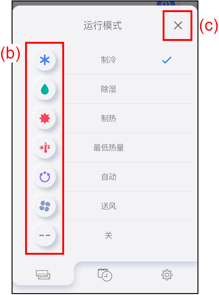主页 主菜单 各空调画面 运行模式设置 注: 空调已停止时,无法设置运行模式。 若要更改运行模式,轻按按键(a)。出现“运行模式”窗口。 显示所选的运行模式。 轻按所需运行模式的图标(b)。运行模式更改,并且窗口关闭。 若要在未更改运行模式的情况下关闭窗口,轻按(c)。 注: 某些功能可能不会出现,这取决于空调。