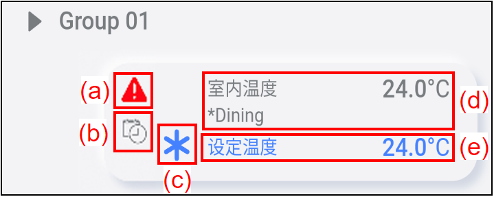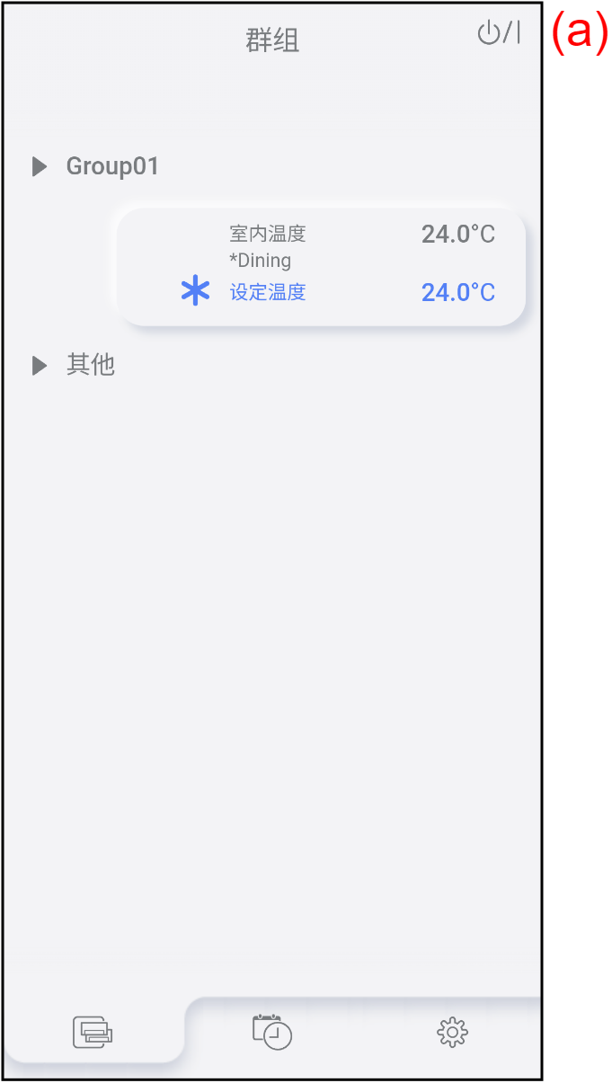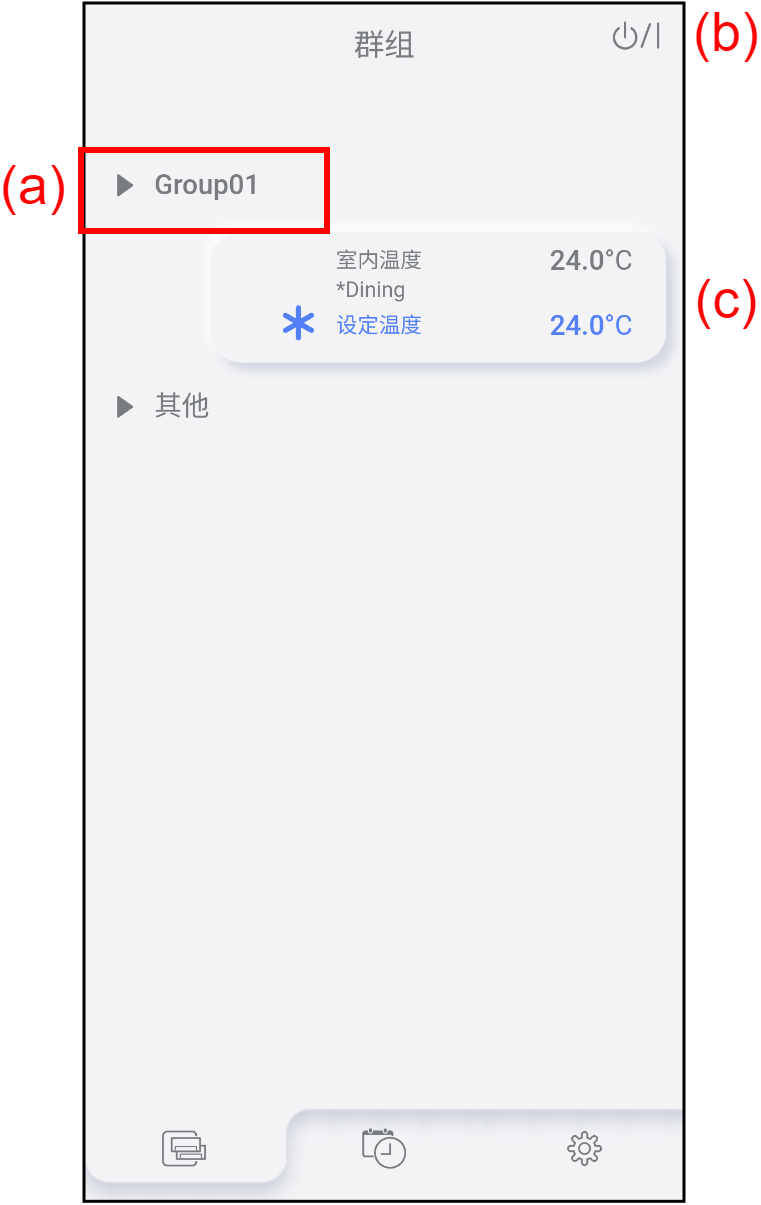 | (a) | 群组名称 | 若要检查群组中的空调列表,轻按此处。 参考“空调列表画面”了解详情。 |