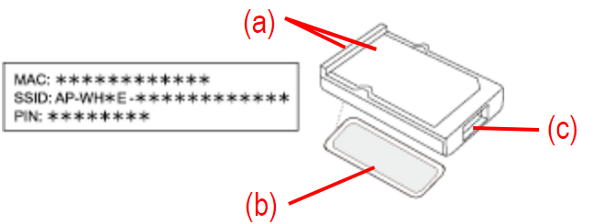 (b) Nálepka s informáciami o adaptéri (pripevnený k adaptéru WLAN páskou)