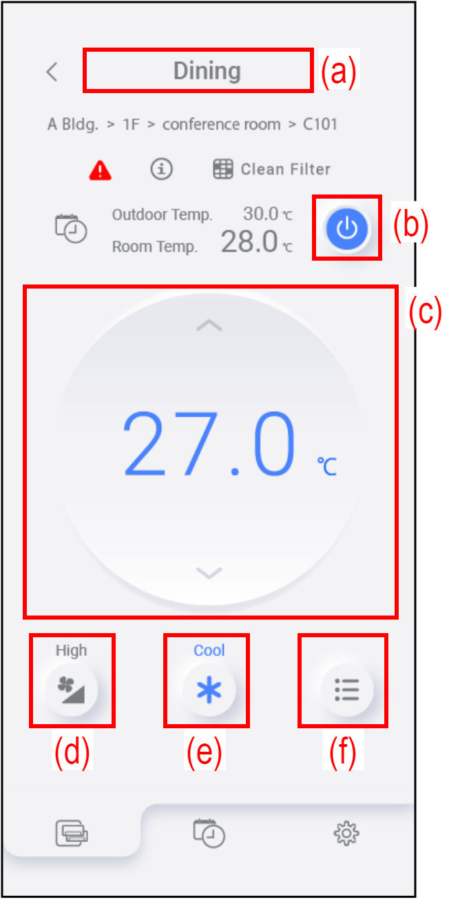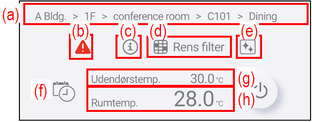 | (a) | Názov skupiny | Zobrazuje názov skupiny, ktorá obsahuje klimatizačnú jednotku. Ak nie je nastavená žiadna skupina, táto položka sa nezobrazí. |