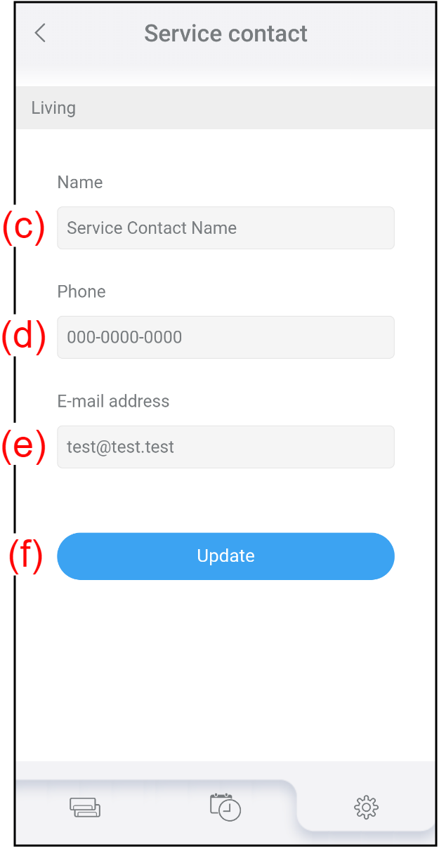 (d) Phone Vnesite telefonsko številko servisnega osebja ali podjetja. (e) E-mail address Vnesite e-poštni naslov servisnega osebja ali podjetja.