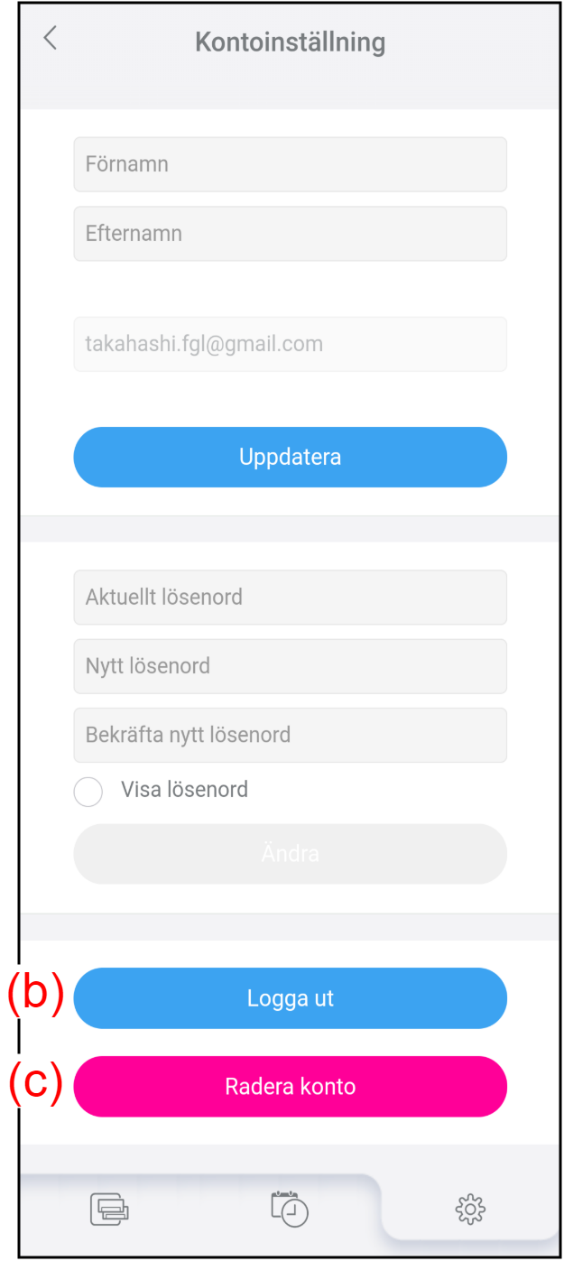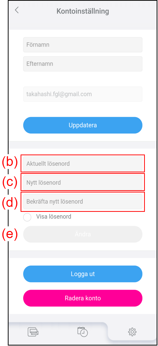Tryck på (a) på skärmen ”Inställning” för att ändra din kontoinformation och ditt lösenord.