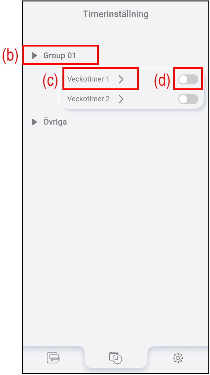 Tryck på (b) för att kontrollera eller redigera inställningarna för veckotimern. Se ”Timerinställningsprocess” för mer information.