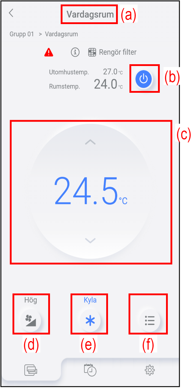 | (a) | Gruppnamn | Det visar namnet på gruppen som innehåller luftkonditioneringsapparaten. Om ingen grupp har ställts in visas inte denna post. |