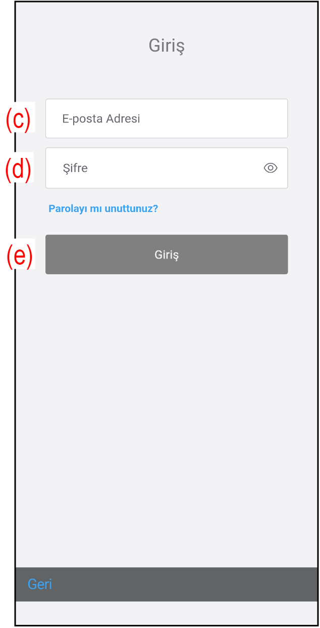 - Kayıt olduğunuz e-posta adresi (c) ve şifre (d) ile giriş yapın.