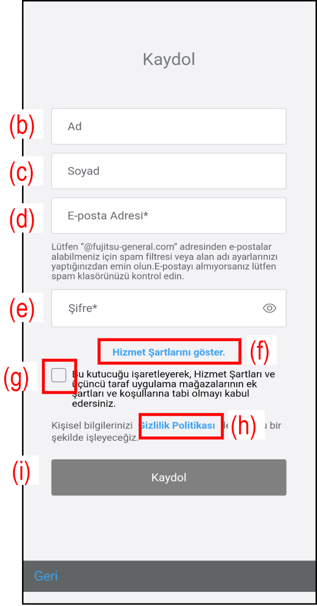 * Akıllı telefonunuzdan erişebileceğiniz bir e-posta adresi kullanın.(e) Şifre Alfanümerik karakterlerden oluşan seçtiğiniz bir şifre girin. Şifre en az üç büyük harf, küçük harf, rakam ve sembolden oluşan bir kombinasyondan oluşmalıdır.