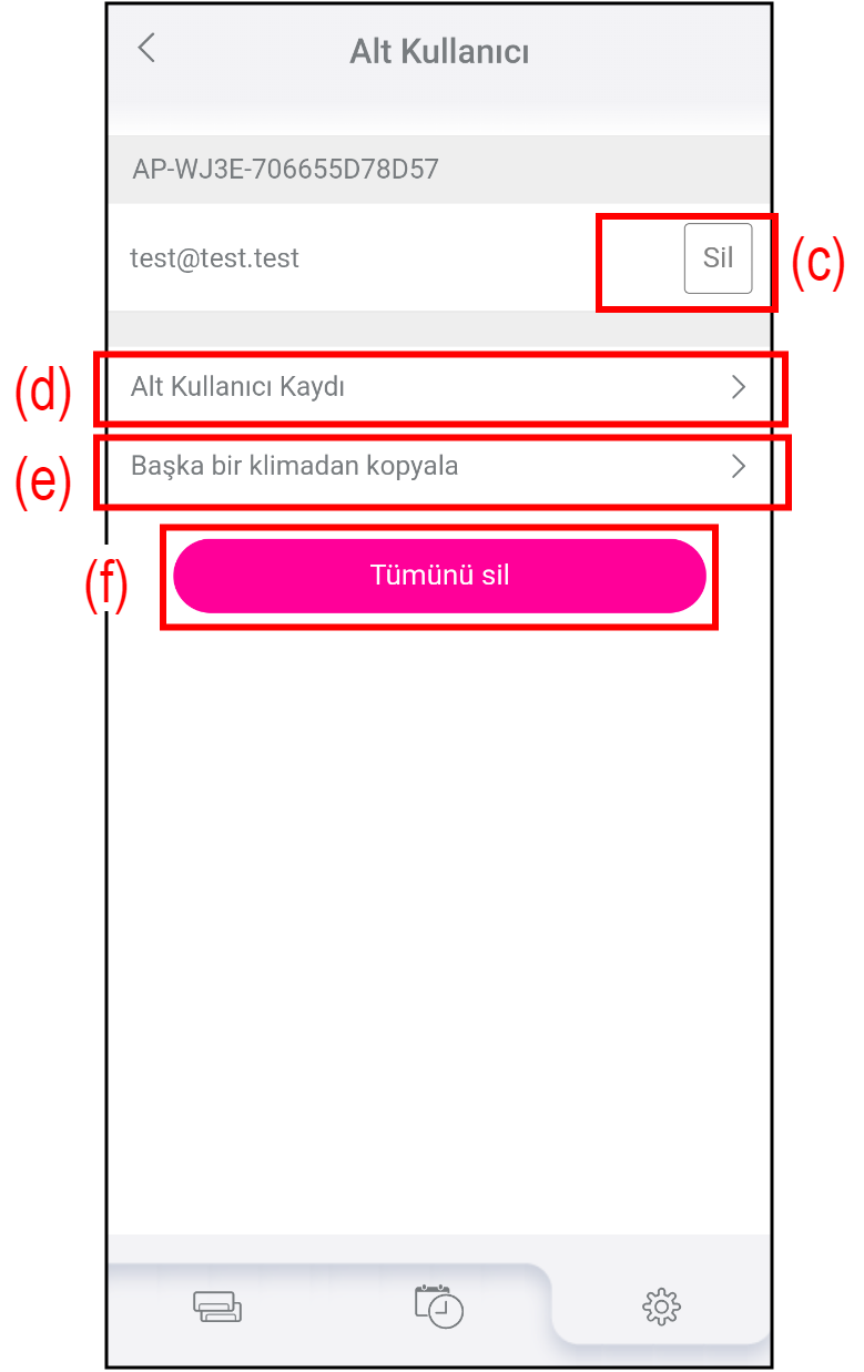 Alt kullanıcının ayarlarını başka bir klimadan bu klimaya kopyalamak için (e) düğmesine basın. "Başka bir klimadan alt kullanıcı ayarlarını kopyalamak" içeriğine bakınız.