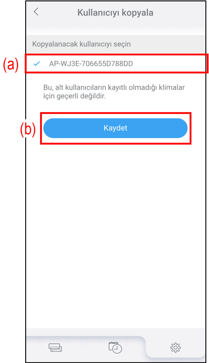 - Kopyalamak istediğiniz alt kullanıcı ayarlarının bulunduğu klimayı (a) "Kullanıcıyı Kopyala" ekranında seçin.