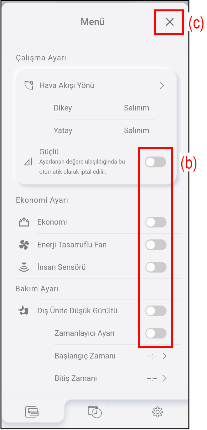 - Hava akışı yönü (yukarı/aşağı veya sol/sağ)