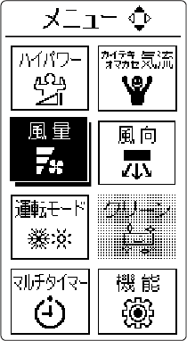 HOME 基本の使いかた 風の強さを変える 詳しい機能の働きを知りたい方はこちら操作のしかた 運転中に を押すメニュー画面が表示されます。 で風量を選び を押す快適おまかせ気流設定中は、下の画面が表示されます。 を押すと、快適おまかせ気流が解除され、風量選択画面になります。 でお好みの風量を選び、 を押す詳しい機能の働きさらさら冷房運転中、除湿運転中、ランドリー運転中、おまかせノクリアで運転中は、風量の変更はできません。自動運転開始時に風量を変更したときは、エアコンが運転の種類を選んだあとに風量が変更されます。 (→ 運転する(自動運転))自動運転で除湿・監視運転(送風)が選ばれたときは、音声案内を行いますが、風量の変更はできません。<風量自動について>設定温度とお部屋の温度の差が大きいと強めの風で運転し、差が小さくなると徐々に弱めの風で運転します。送風運転中は、弱風で運転します。