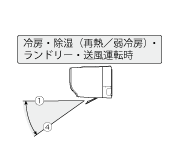 HOME 基本の使いかた スイング・ワイド ※ 操作は、運転を開始し風向板が停止してから行ってください。詳しい機能の働きを知りたい方はこちらスイングを使う操作のしかた 運転中に を押すメニュー画面が表示されます。 で を選び を押す快適おまかせ気流設定中は、下の画面が表示されます。 を押すと、快適おまかせ気流が解除され、風向選択画面になります。 でスイングを選び、 を押す▶ 次の場合は風向を変えることはできません。おまかせノクリアで運転中上下風向左右風向風向をワイドにする操作のしかた 運転中に を押すメニュー画面が表示されます。 で を選び を押す快適おまかせ気流設定中は、下の画面が表示されます。 を押すと、快適おまかせ気流が解除され、風向選択画面になります。 でワイドを選び、 を押す▶ 次の場合は風向を変えることはできません。おまかせノクリアで運転上下風向左右風向詳しい機能の働きスイングについて上下スイング:冷房や暖房など、運転の種類に合わせて、図の範囲でスイングします。除湿(再熱)・ランドリー運転中は、除湿効果を高めるために外気温やお部屋の温度によりおよそ①⇔④か、およそ⑤⇔⑧のどちらかにスイングを行います。送風運転中は、スイング風向設定前の風向位置により①⇔④か、⑤⇔⑧のどちらかにスイングを行います。冷房・除湿(再熱/弱冷房)・ランドリー・送風運転時暖房・除湿(再熱)・ランドリー・送風運転時左右スイング:室内機の据付位置の設定(→ 人感センサーと据付位置を設定する)に合わせて、次の範囲でスイングします。据付位置の設定とスイングの範囲左左吹き① ⇔ 右吹き中央左吹き② ⇔ 右吹き右左吹き② ⇔ 右吹き上下スイングと左右スイングを設定すると、上下スイングと左右スイングを組み合わせてスイングします。エアコンから風が出ていないときや、ごく弱い風で運転しているときには、スイングが一時的に止まることがあります。