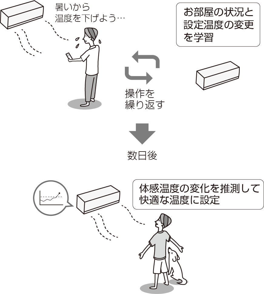 お部屋の状況やお客様の設定温度の変更パターンをAI が学習して、設定温度を自動で変更します。また、ノクリアがお住まい周辺の気象情報から予測して、おすすめのタイマー予約を提案します。