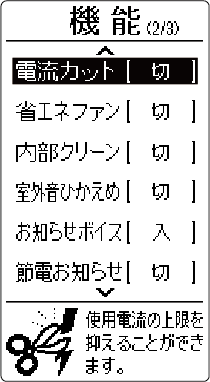 HOME 便利な機能 電流カット お買い上げ時の設定切使用電流の上限を抑えることができます。他の電気機器をよく使う時間帯など、ブレーカー落ちが心配なときなどに役立ちます。詳しい機能の働きを知りたい方はこちら設定のしかた を押すメニュー画面が表示されます。 で を選び を押す で「電流カット」を選び を押す で「大」または「小」を選び を押す大冷房・暖房運転時に使用電流の上限をおよそ1/2 下げた運転をします。小暖房運転時に使用電流の上限をおよそ1/4 下げた運転をします。切電流カットは働きません。詳しい機能の働き設定温度の範囲について電流カットを設定していても自動霜取り運転時(→ 自動霜取り運転)、外気温が高いとき(約 40℃以上)、加熱除菌運転中、または室外機が運転開始後約80 秒間は、使用電流の上限が高くなります。電流カットを設定すると、暖まり(冷え)が遅くなる場合や設定温度に到達しない場合があります。このときは、電流カットを「切」にしてください。電流カットを設定すると、次回運転時も同じ設定で運転をします。