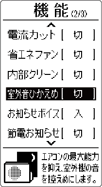 HOME 便利な機能 室外音ひかえめ お買い上げ時の設定切暖房時に運転能力を抑えることで、室外機の音を控えめにします。※ 停止中のみ設定を変更できます。詳しい機能の働きを知りたい方はこちら設定のしかた 停止中に を押すメニュー画面が表示されます。 で を選び を押す「室外音ひかえめ」を選び を押す でお好みの設定を選び を押す詳しい機能の働き室外音ひかえめについて室外音ひかえめ機能を「入」に設定したときは、最大能力を抑えるため、お部屋が暖まるまで時間がかかる場合があります。お部屋の温度が設定温度に近いときなどは、室外音ひかえめ機能を「入」に設定しても、運転音が下がらない場合があります。