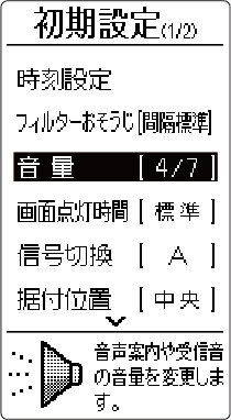 HOME 初期設定 音量 音量を変更するお買い上げ時の設定4詳しい機能の働きを知りたい方はこちら設定のしかた を押すメニュー画面が表示されます。 でお知らせ を選び を押す で「初期設定」を選び を押す で「音量」を選び を押す でお好みの音量を選び を押す設定と同時に受信音を確認してください。詳しい機能の働き音量についてエアコンからの音声案内と受信音の音量を調節することができます。音量を「自動」に設定すると、時間帯によって次のように音量を自動で調節します。時間帯音量午前6 時~午後10 時4午後10 時~午前6 時2音量を「自動」に設定する場合、リモコンの時刻設定が合っていることを確認してください。(→ 時刻設定)