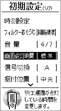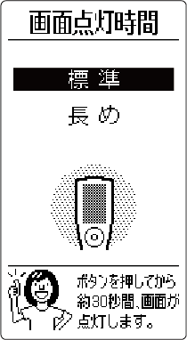HOME 初期設定 画面点灯時間 お買い上げ時の設定標準リモコンの画面が点灯している時間を変更することができます。操作のしかた を押すメニュー画面が表示されます。 でお知らせ を選び を押す で「初期設定」を選び を押す で「画面点灯時間」を選び を押す でお好みの設定を選び を押す標準ボタン操作をしてから約30秒後に画面の表示が消えます。長めボタン操作をしてから約60秒後に画面の表示が消えます。(「長め」に設定すると、リモコンの電池の減りが早くなることがあります。)