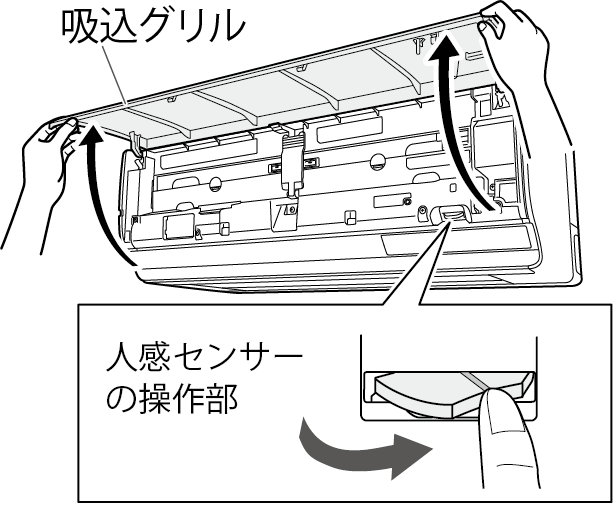 人感センサーの向きを操作部で合わせる 室内機の据付位置に合わせて、操作部を指で押して検知方向を合わせてください。 (検知方向を左右に約30°変えることができます。)