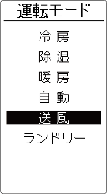 HOME 基本の使いかた 運転する(送風運転) 詳しい機能の働きを知りたい方はこちら操作のしかた を押す。メニュー画面が表示されます で を選び を押す で「送風」を選び を押す で運転を停止する。詳しい機能の働き送風運転についてお部屋の空気を循環させたいときや、風に当たりたいときなどにお使いください。サーキュレーターと同様にお部屋の中の空気を循環させることができます。風が遠くまで届くので、お部屋の空気の温度ムラを効率よく解消させることができます。送風中に窓を開けて換気をすると、室内にこもっている熱気を逃すことにも利用できます。吹出し方向を変えることができるので、扇風機のように風に当たることもできます。