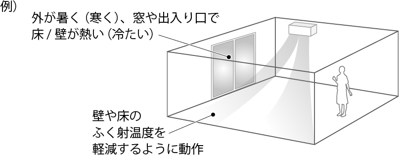 運転の種類に合わせて、風量と風向をおすすめの設定にします。また、お部屋の温度ムラを検知すると、独立した左右風向板で気流を吹き分けることで、お部屋全体を温度ムラのない快適な空間にします。